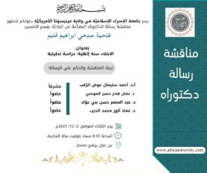 نوقشت رسالة الدكتوراه المقدّمة من الطالبة فتحيّة غنيم بقسم الدراسات الإسلامية، وذلك بحضور نخبة من الأساتذة والباحثين والمهتمين بالشأن الشرعي والأكاديمي.