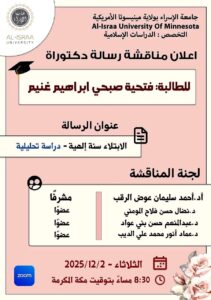 وجاءت الرسالة بعنوان “… (الابتلاء سنة الهية دراسة تحليلية)”، وتناولت فيها الباحثة بالتحليل والدراسة موضوعًا مهمًا في مجال الدراسات الإسلامية، معتمدة على المنهج العلمي الدقيق، والرجوع إلى المصادر الأصلية، وتقديم رؤية بحثية تُسهم في إثراء المعرفة في تخصصها.